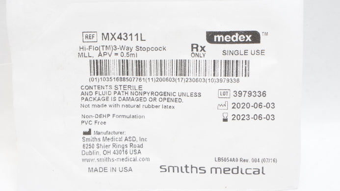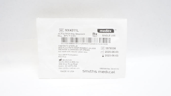 - Smiths Medical MX4311L Medex Hi-Flo 3 Way Stopcock MLL, APV = 0.5ml (x)