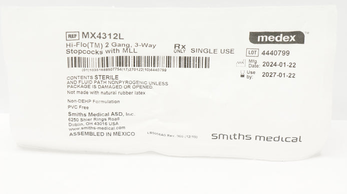 - Smiths Medical MX4312L Medex Hi-Flo 2 Gang, 3-Way Stopcocks with MLL
