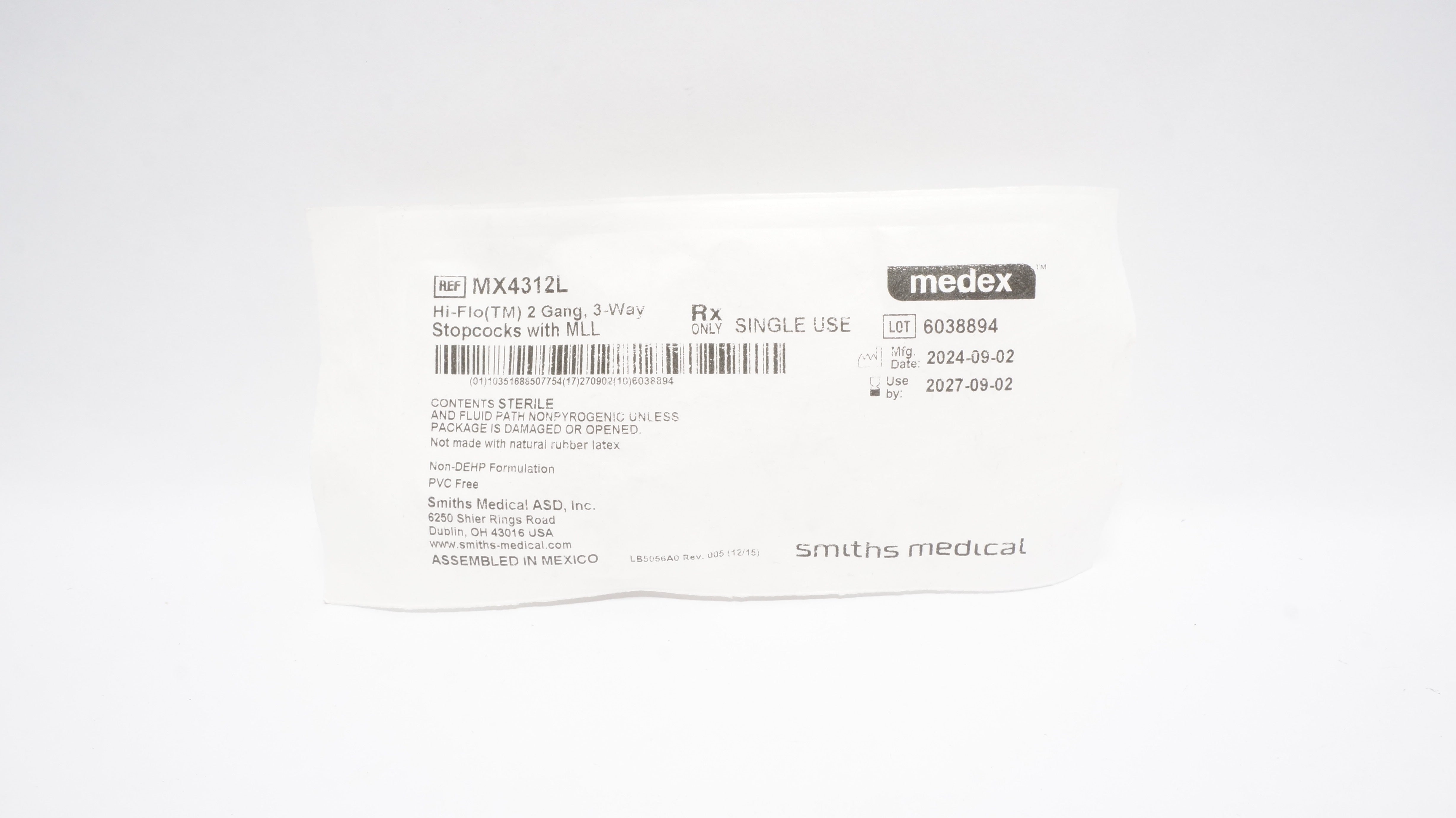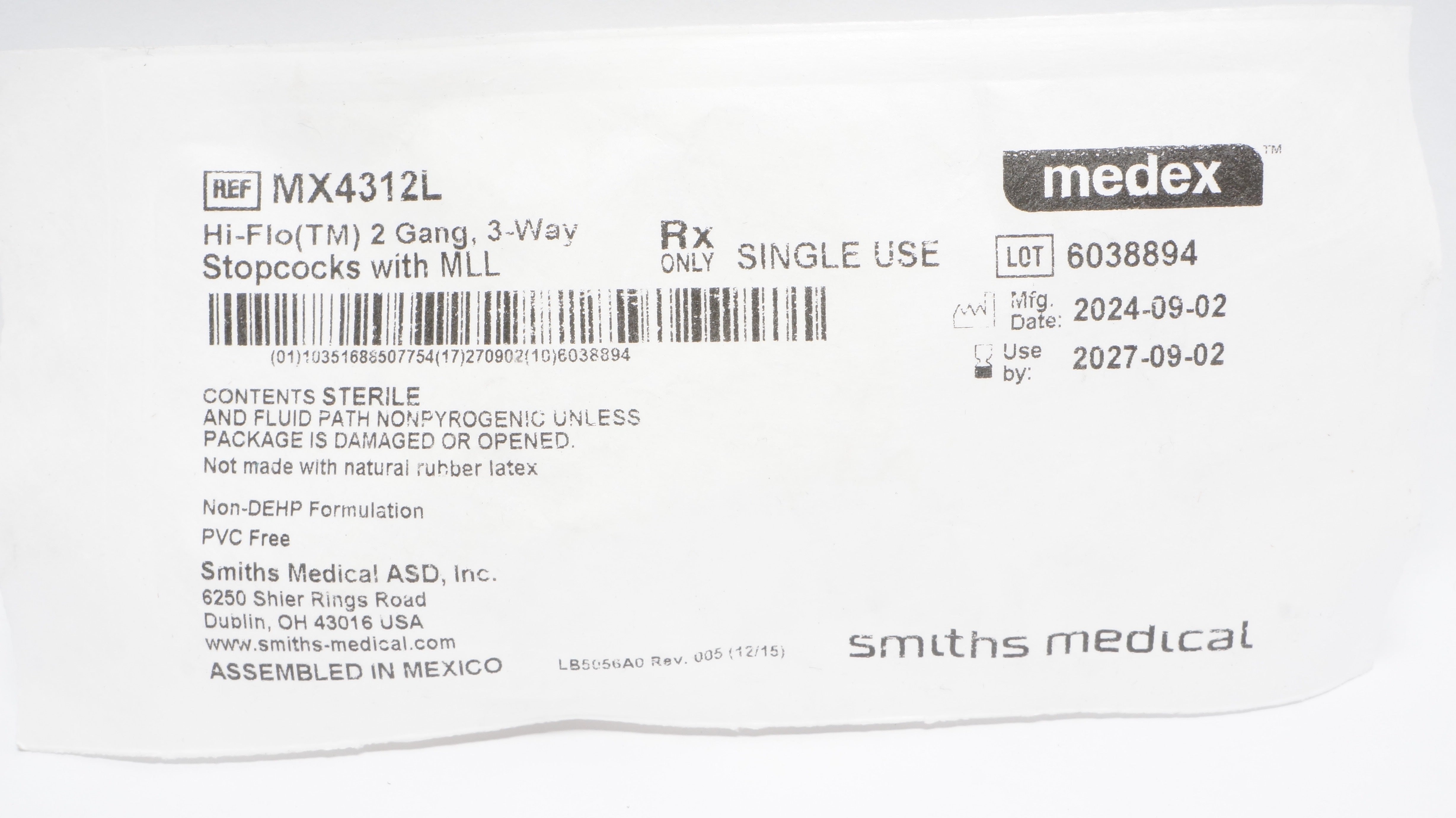 - Smiths Medical MX4312L Medex Hi-Flo 2 Gang, 3-Way Stopcocks with MLL