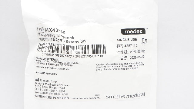 - Smiths Medical MX43860 Medex Four-Way Stopcock w/6 inch Extension