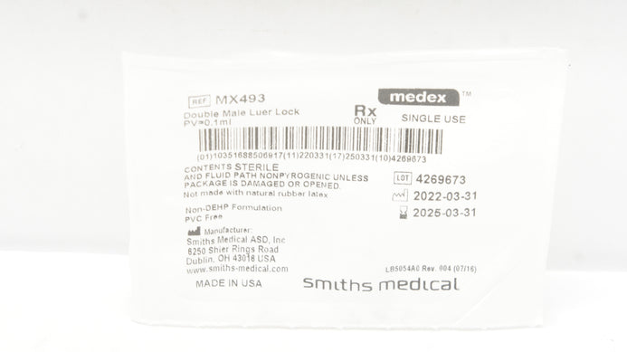 - Smiths Medical MX493 Medex Double Male Luer Lock, PV 0.1mL