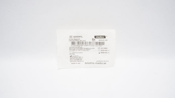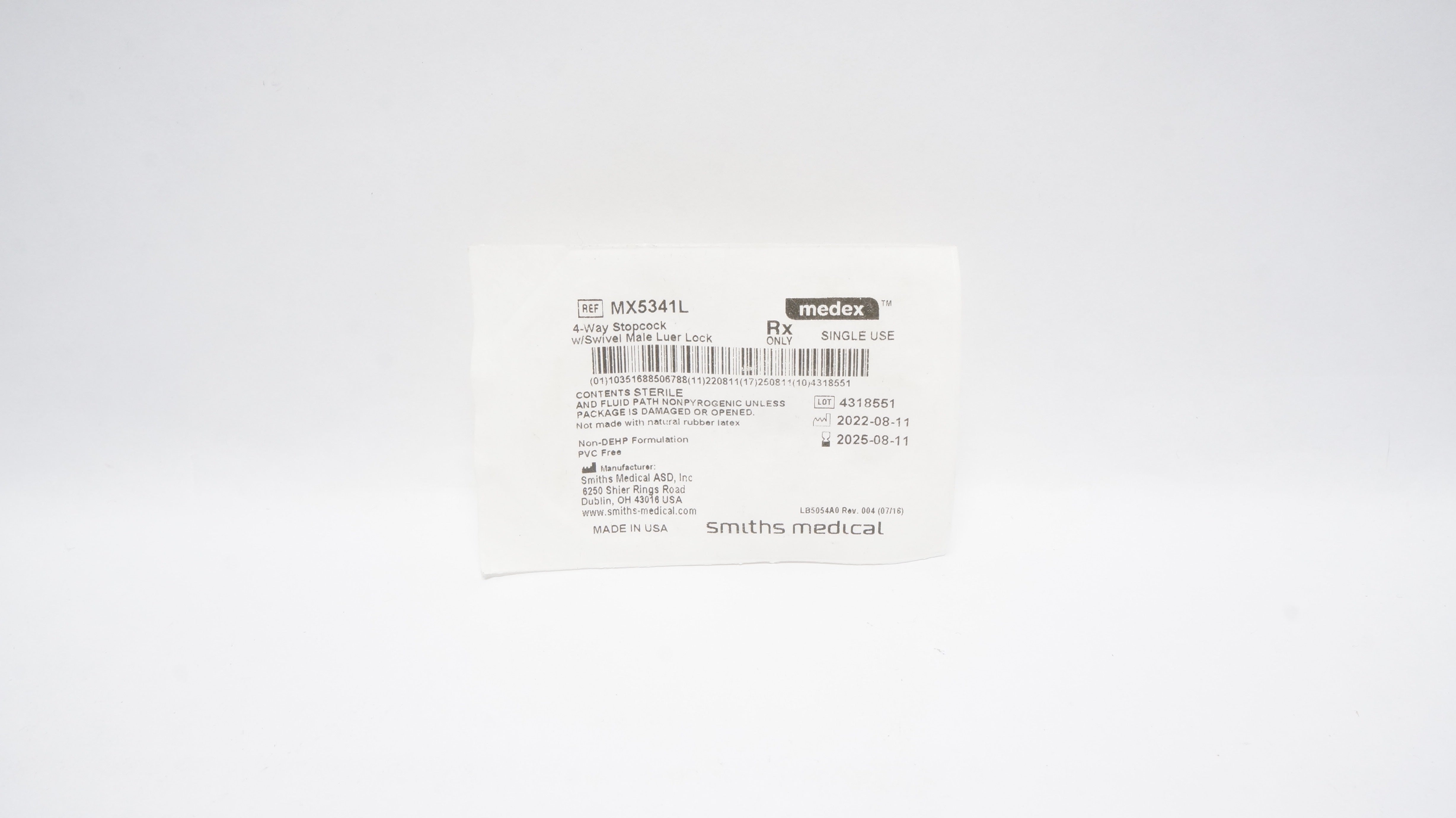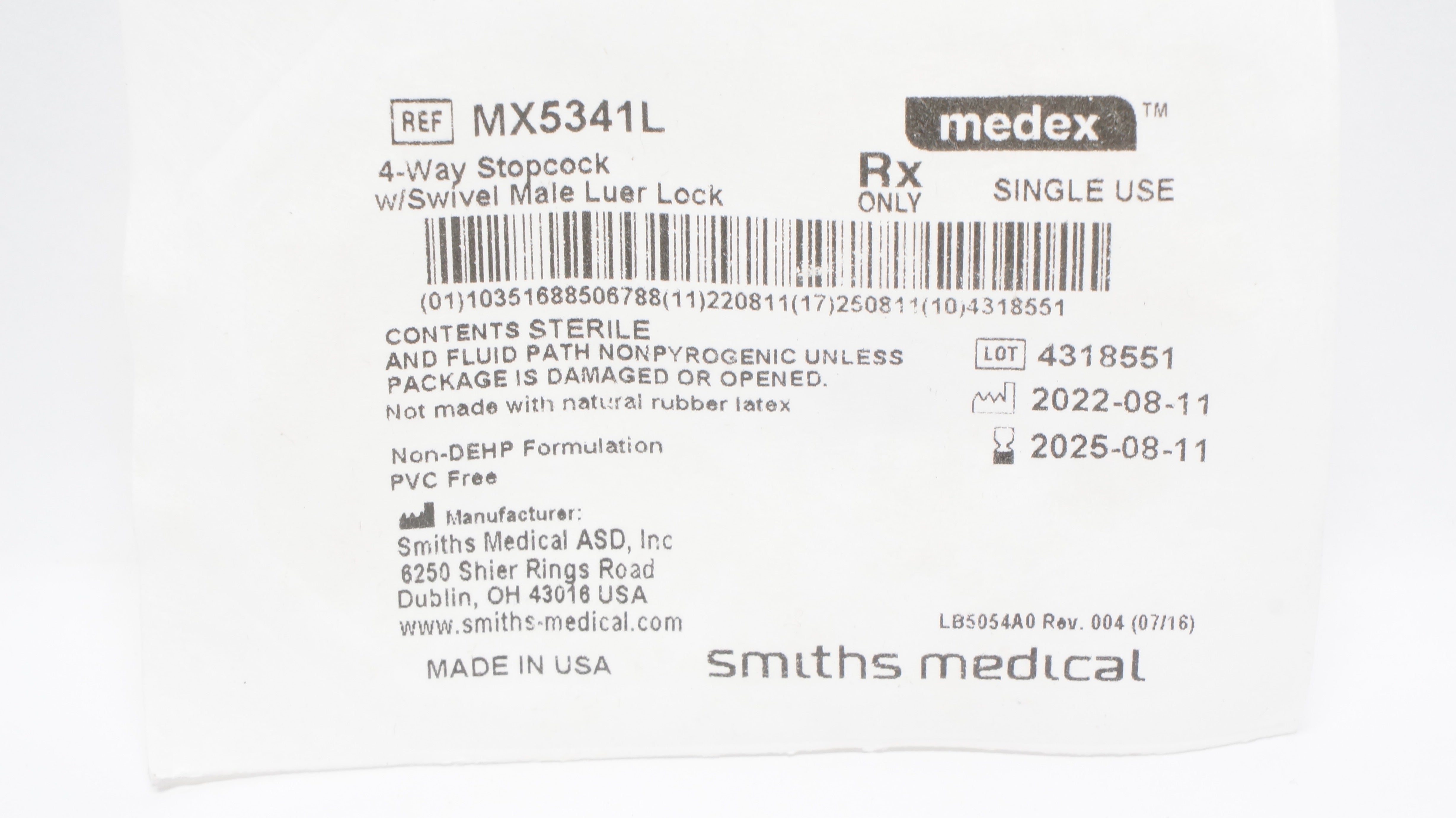 - Smiths Medical MX5341L 4-Way Stopcock w/Swivel Male Luer Lock (x)