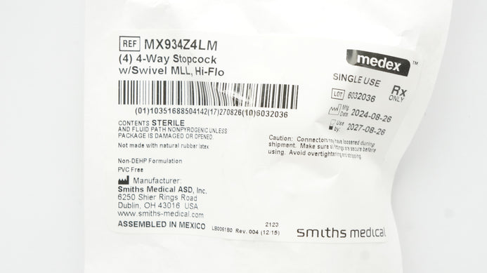 - Smiths Medical MX934Z4LM Medex 4-Way Stopcock With Swivel MLL Hi-Flo - Pack of 4