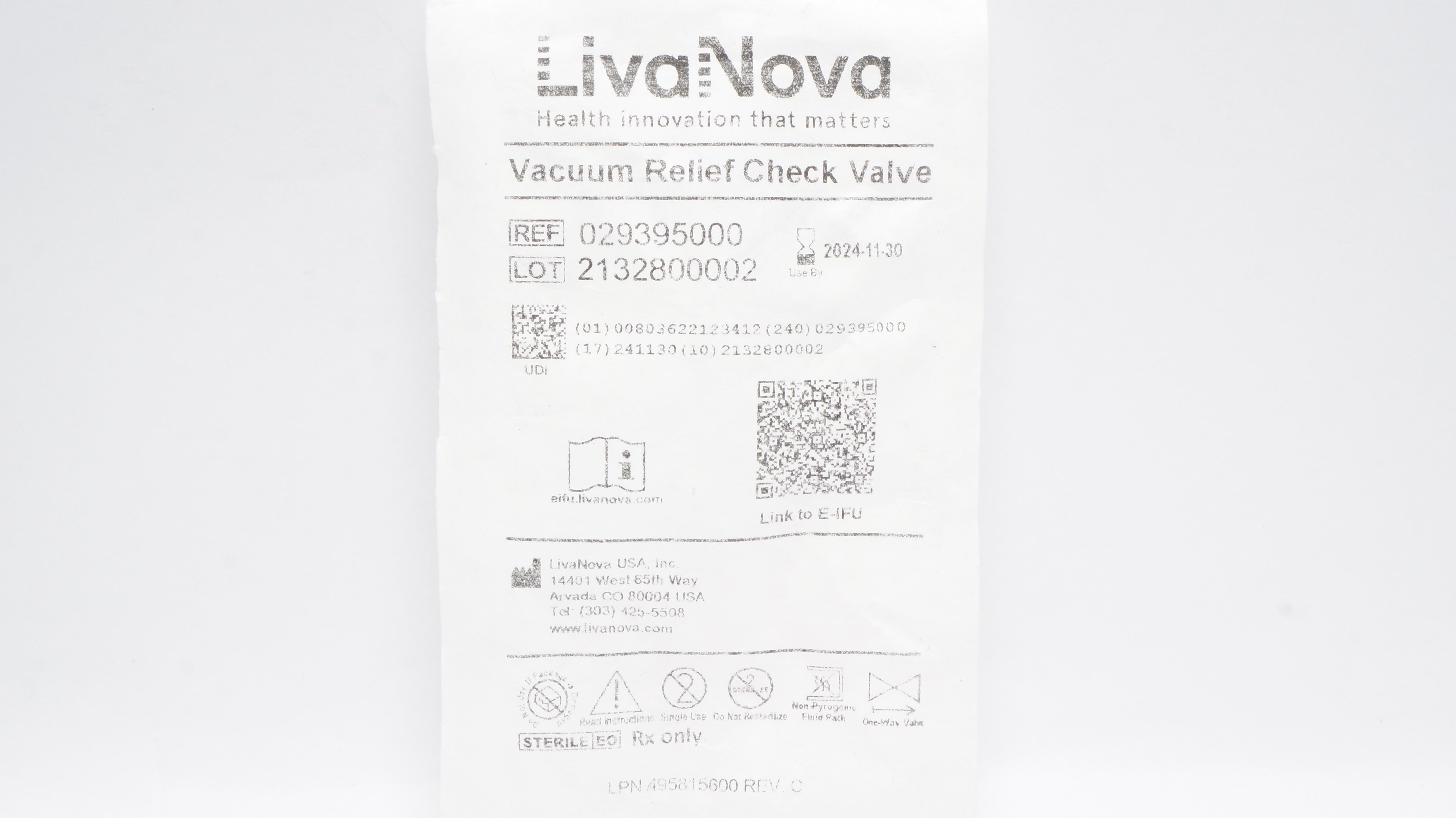 Sorin Group 029395000 Vacuum Relief Check Valve