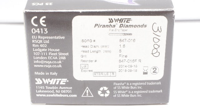 - SS White 847-016FR Piranha Flat-End Taper Diam. 1.6mm, Length 8 (x) ~ Box of 25