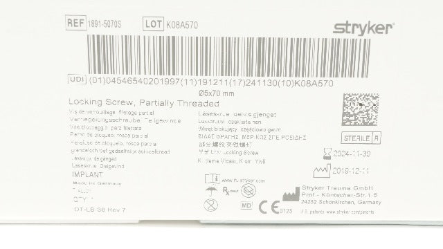 - Stryker 1891-5070S Locking Screw, Partially Threaded 5mm x 70mm (x)