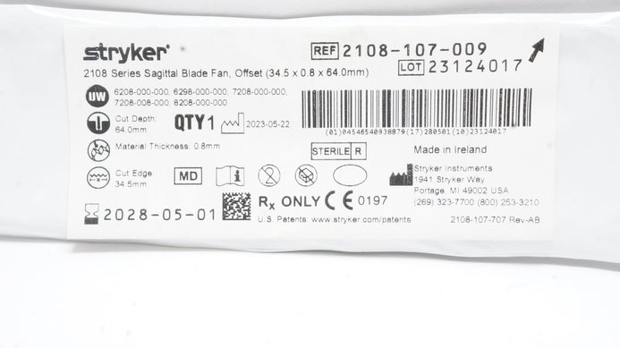 - Stryker 2108-107-009 2108 Series Sagittal Blade Fan, Offset, 34.5 x 0.8 x 64.0mm