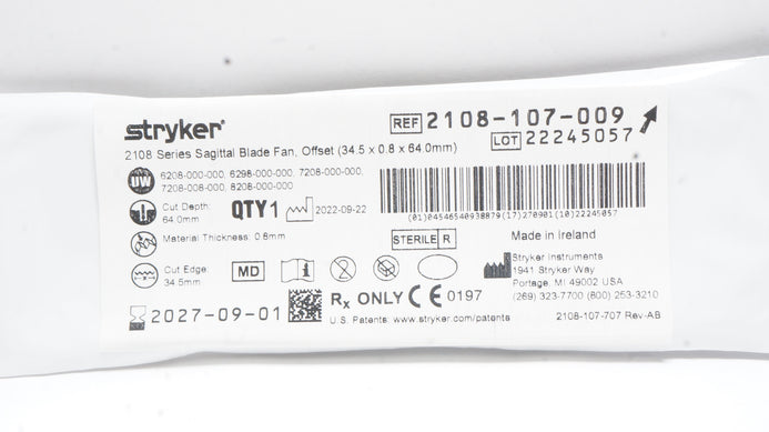 - Stryker 2108-107-009 2108 Series Sagittal Blade Fan, Offset, 34.5 x 0.8 x 64.0mm