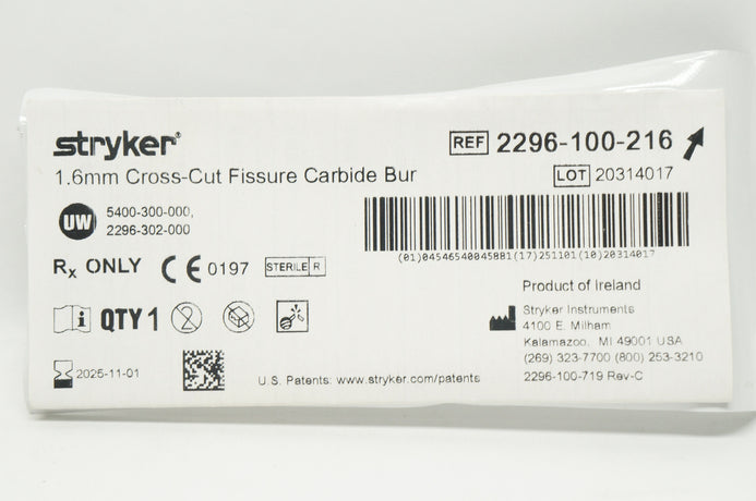 - Stryker 2296-100-216 Cross-Cut Fissure Carbide Bur 1.6mm