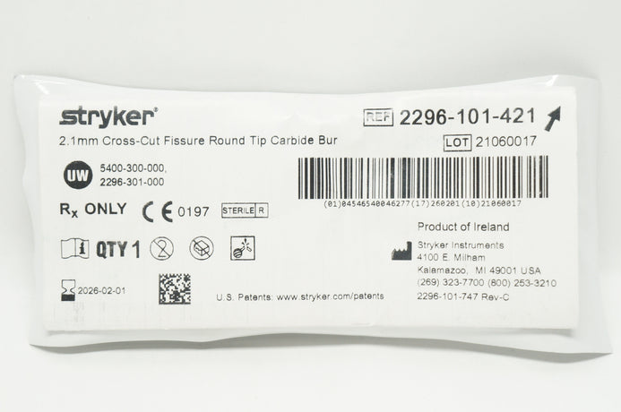 - Stryker 2296-101-421 Cross-Cut Fissure Round Tip Carbide Bur 2.1mm