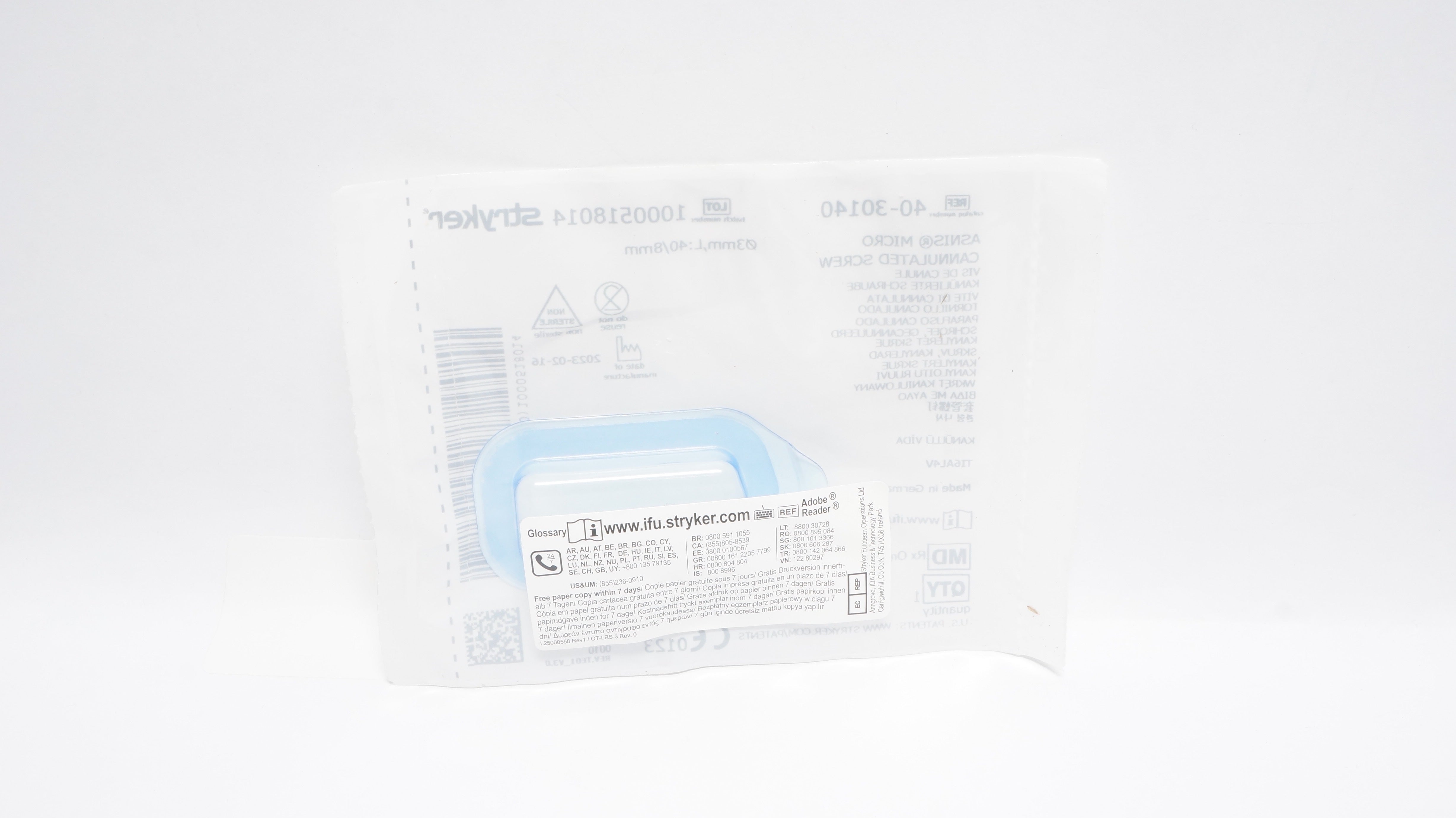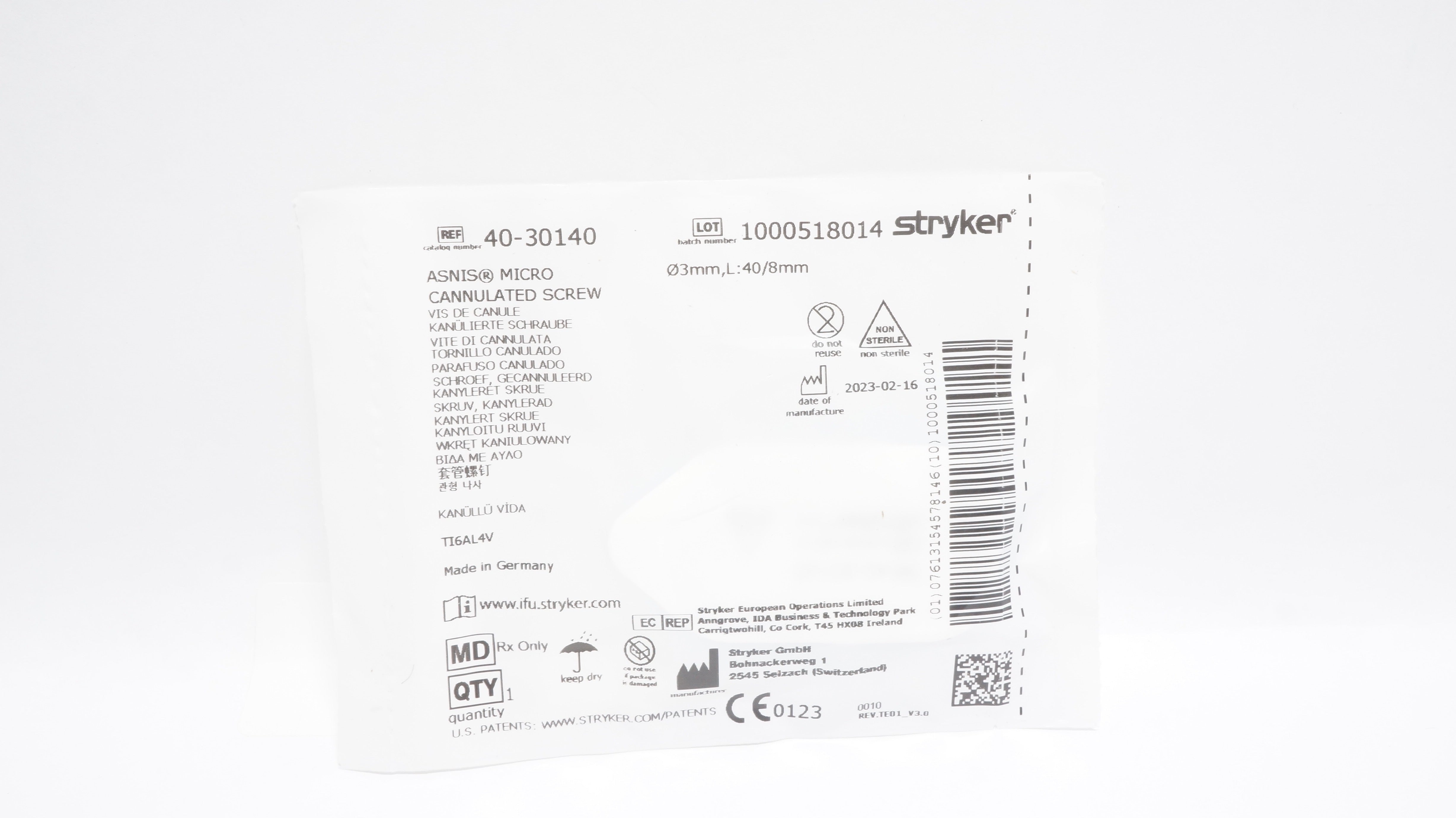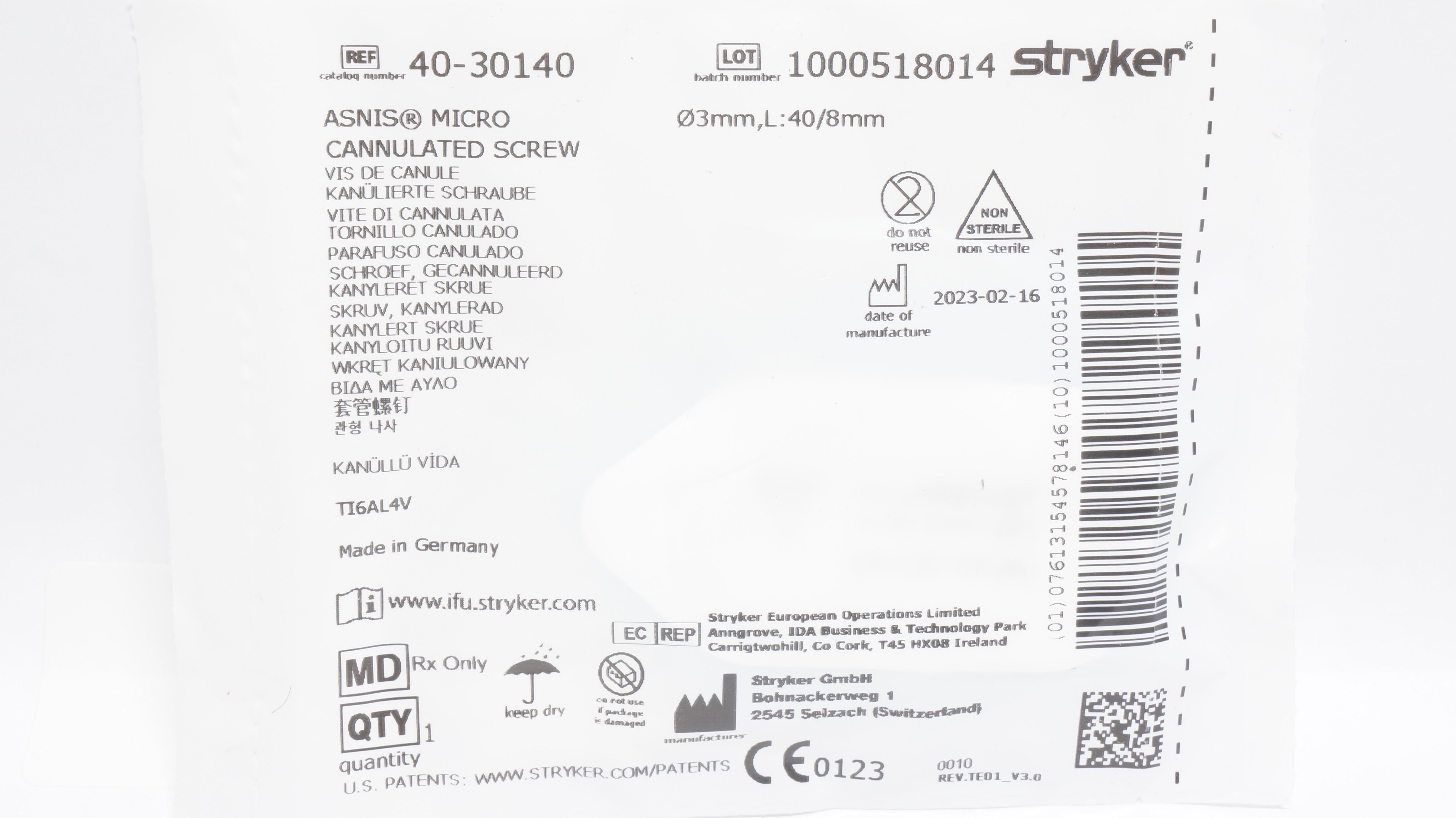 - Stryker 40-30140 ASNIS Micro Cannulated Screw 3mm x 40/8mm
