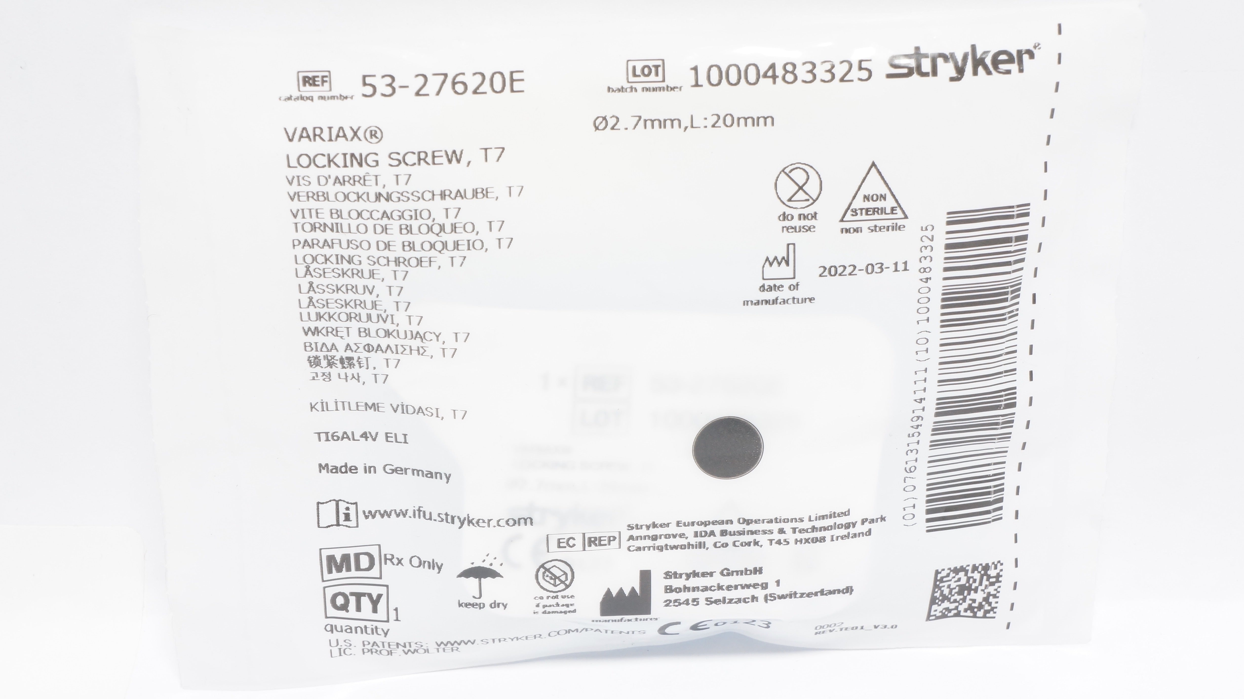 - Stryker 53-27620E Variax Locking Screw T7 2.7mm x 20mm