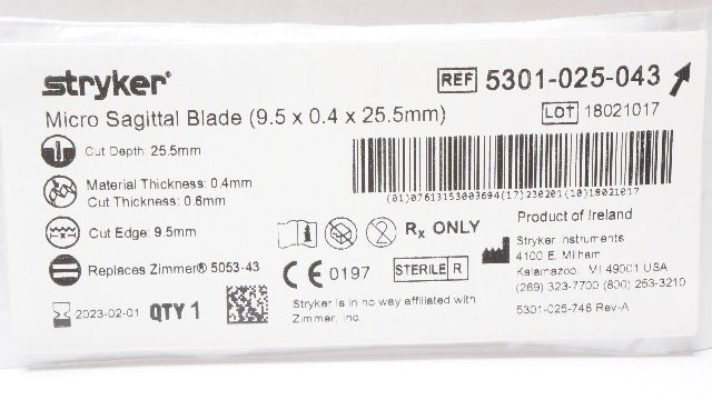 - Stryker 5301-025-043 Micro Sagittal Blade 9.5 x 0.4 x 25.5mm (x)