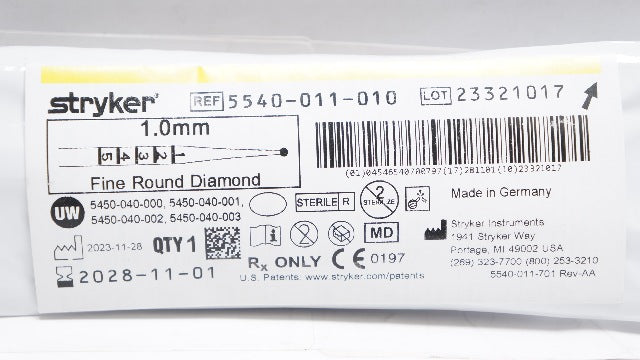 - Stryker 5540-011-010 Fine Round Diamond Bur Extended 1.0mm