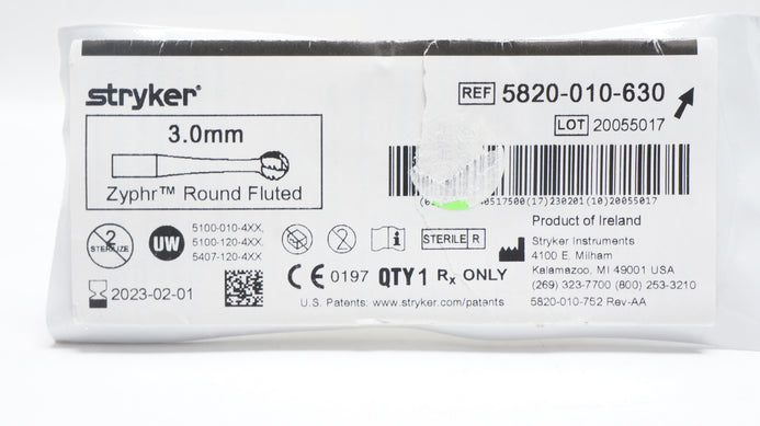 - Stryker 5820-010-630 Zyphr Round Fluted Bur 3.0mm (x)