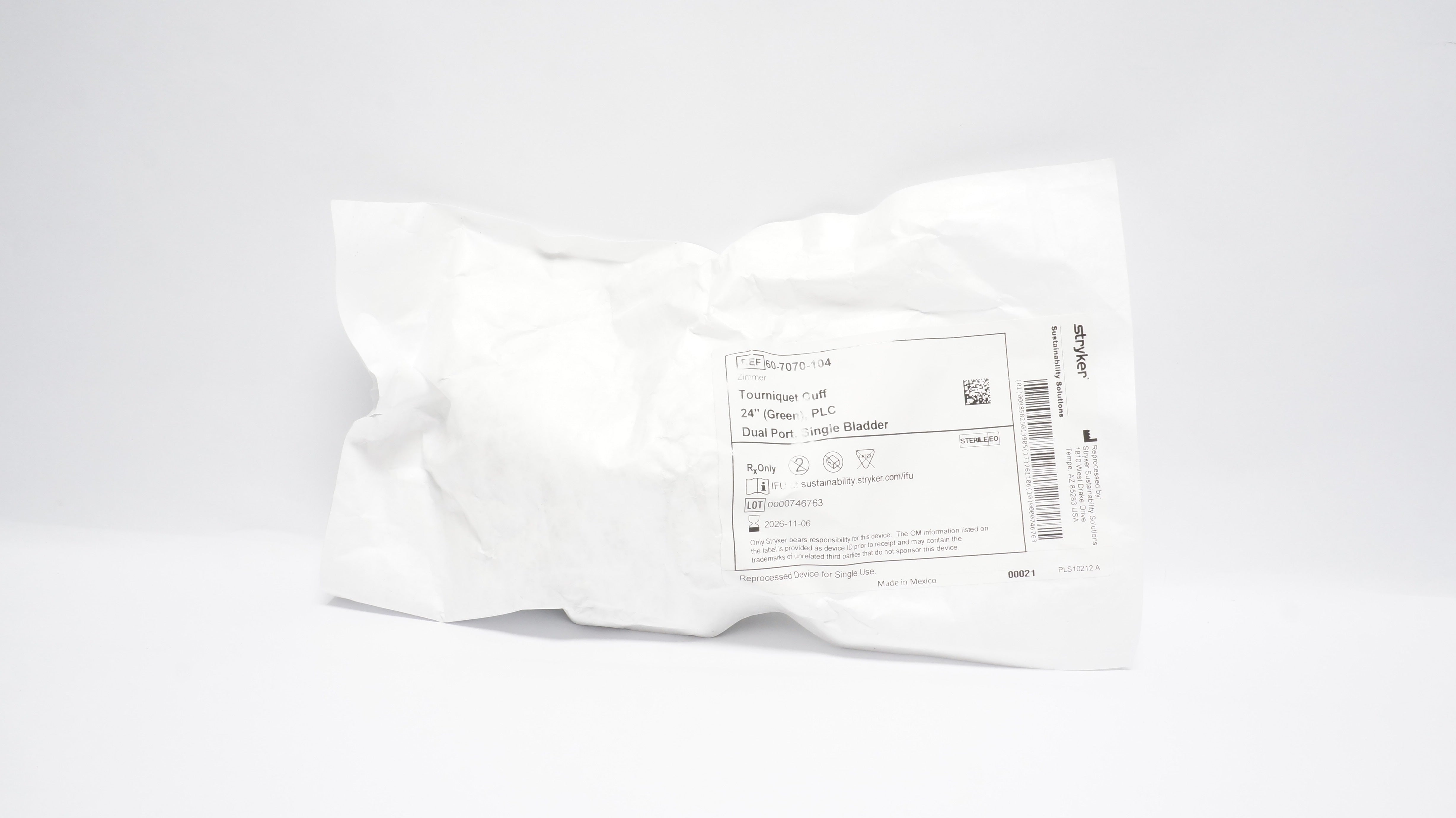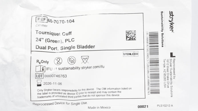 - Stryker 60-7070-104 Tourniquet Cuff 24inch Green PLC Dual Port Single Bladder