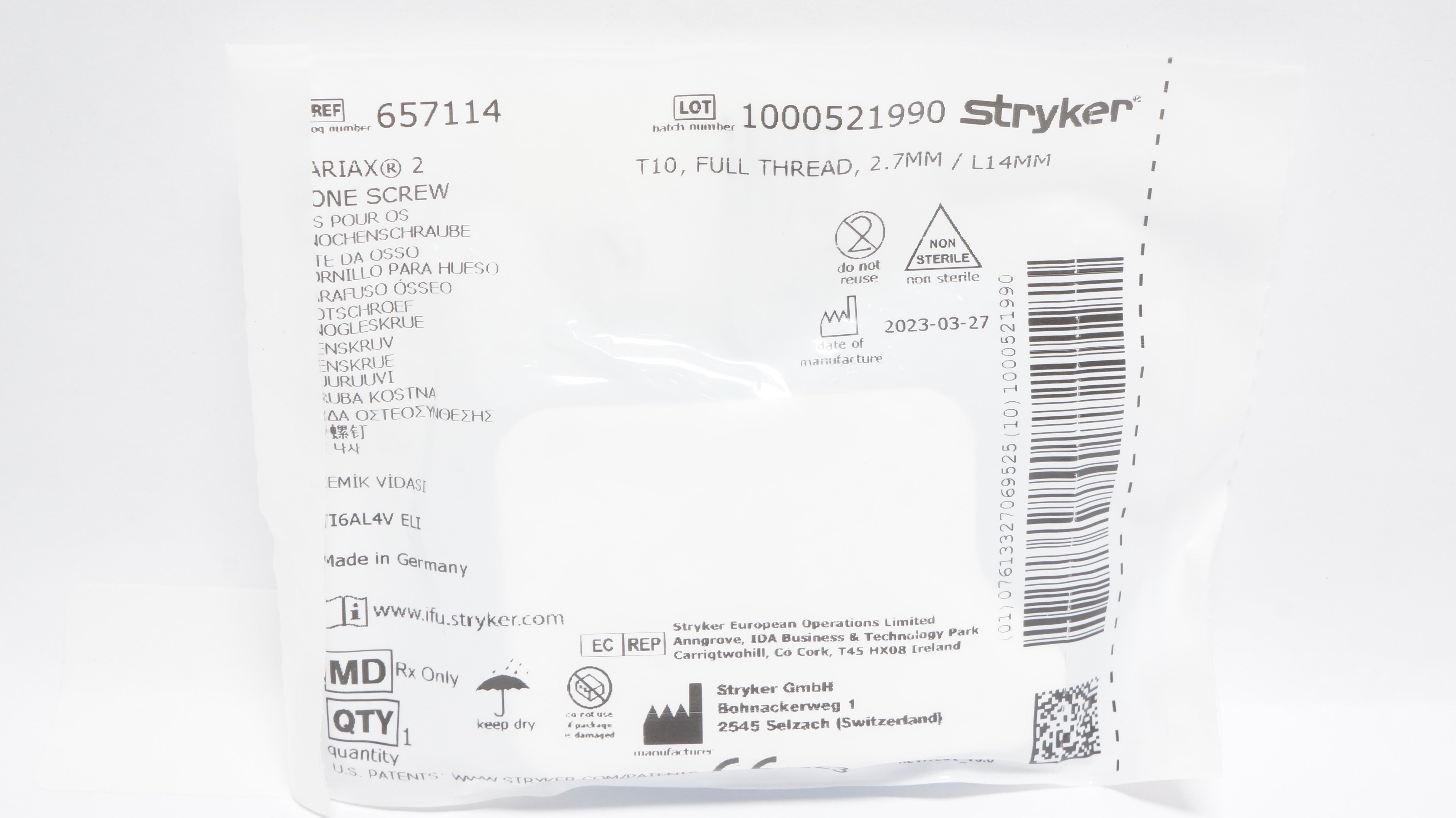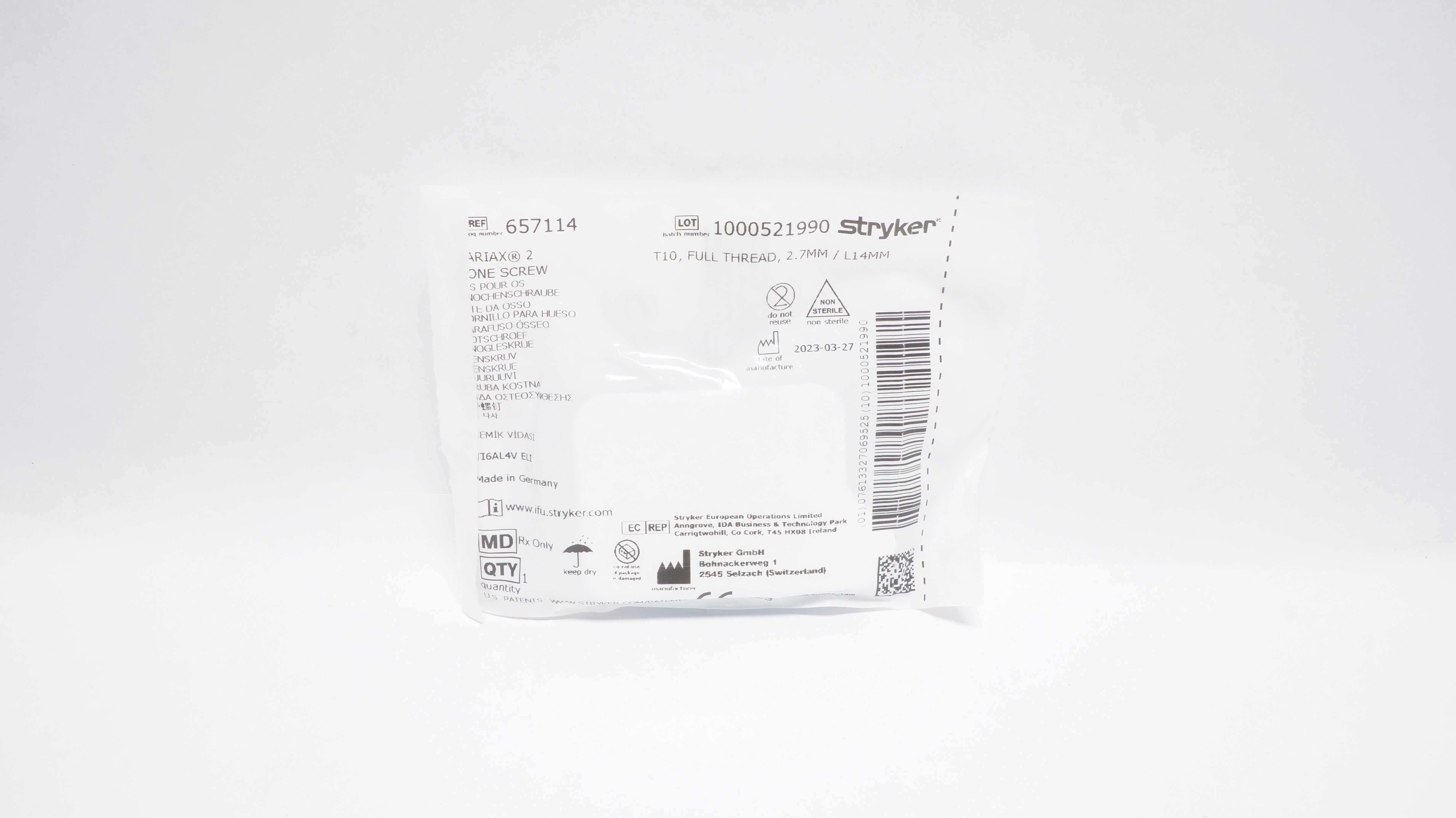 - Stryker 657114 Variax 2 One Screw T10,Full Treaded, 2.7mm/L14mm