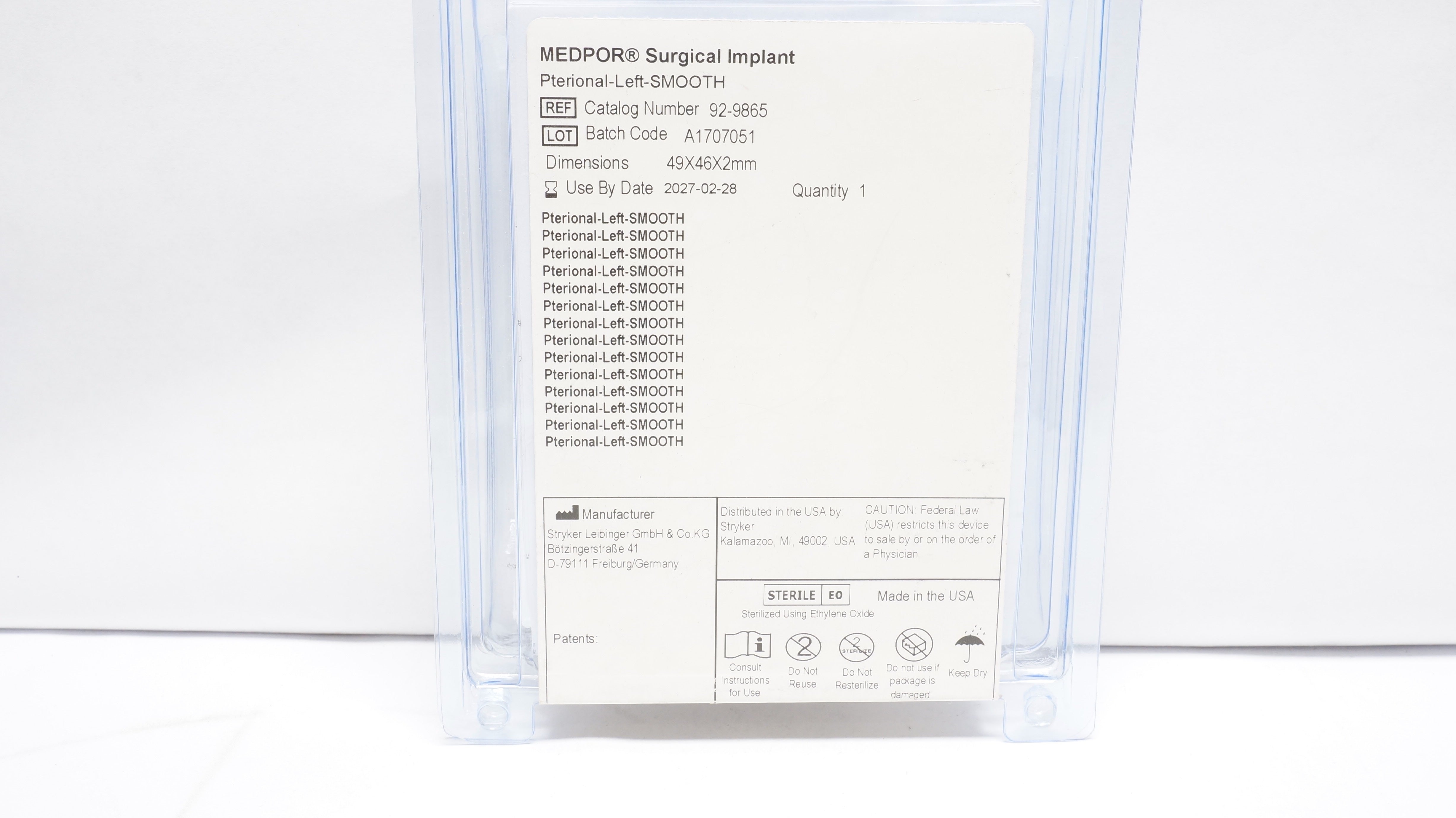 - Stryker 92-9865 Medpor Surgical Implant Pterional Left Smooth 49x46x2mm