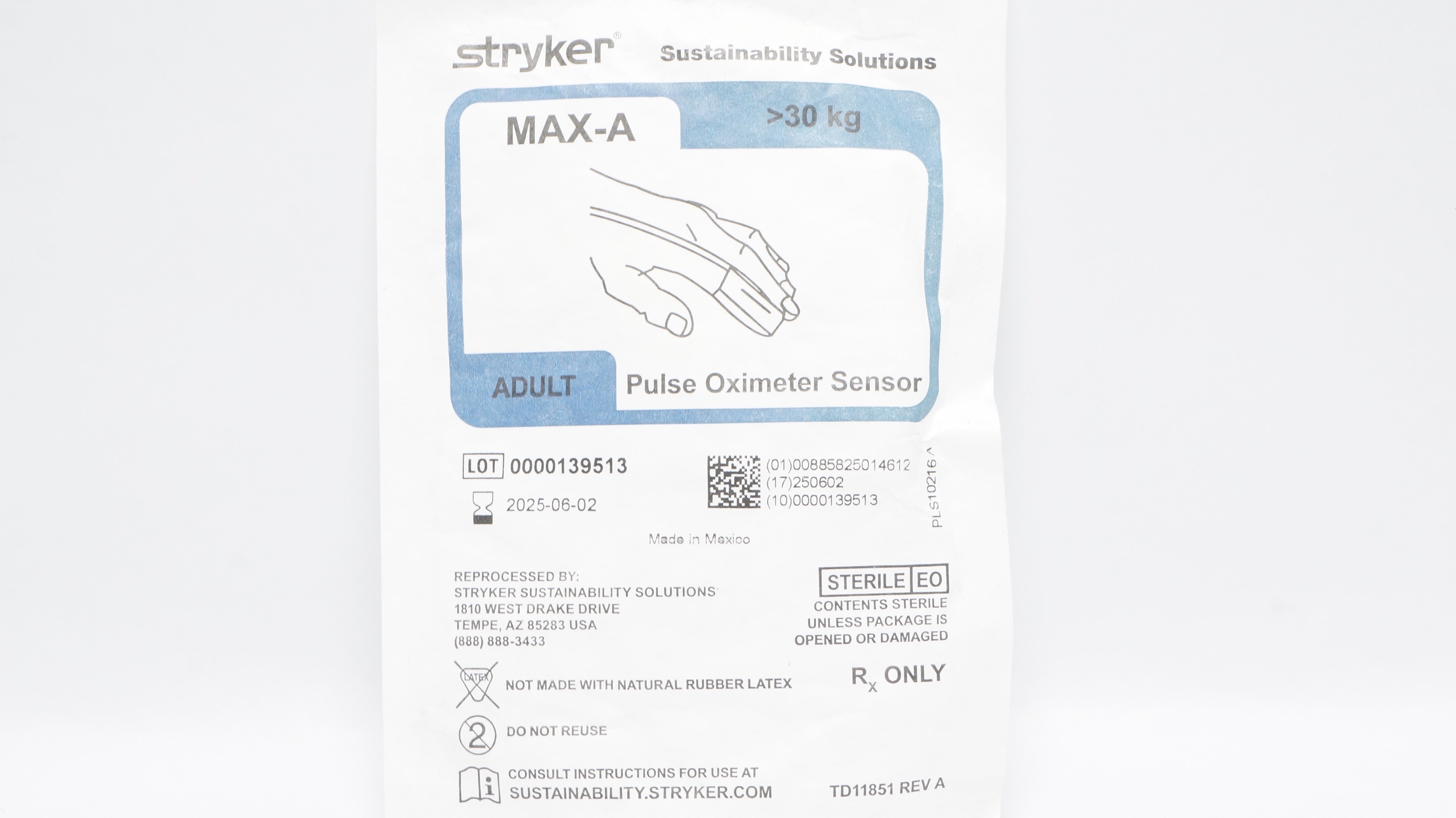 - Stryker MAX-A Sustainability Solutions Adult Pulse Oximeter Sensor >30kg (x)