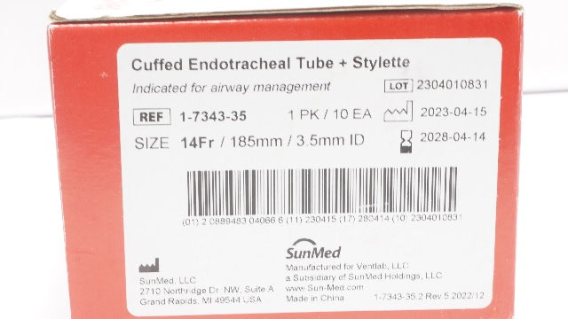 - SunMed 1-7343-35 Cuffed Endotracheal Tube+Stylette 14Fr x 185mmx3.5mm- Box of 10