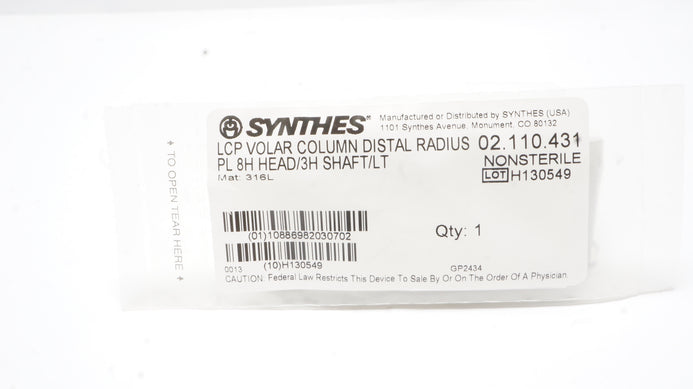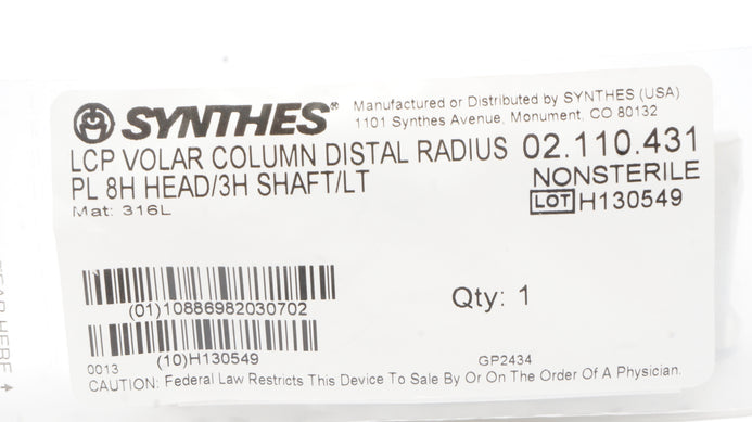 - Synthes 02.110.431 LCP Volar Column Distal Radius PLate 8H HEad/3H Shaft/Left
