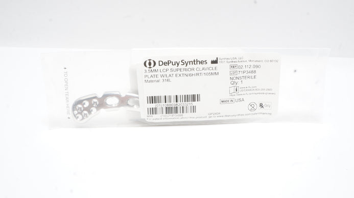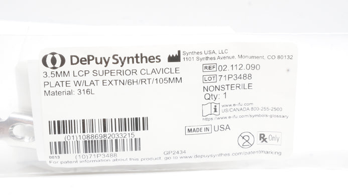 - Synthes 02.112.090 3.5mm LCP Superior Clvicle Plate W/LAT Extn/6H/RT/105mm