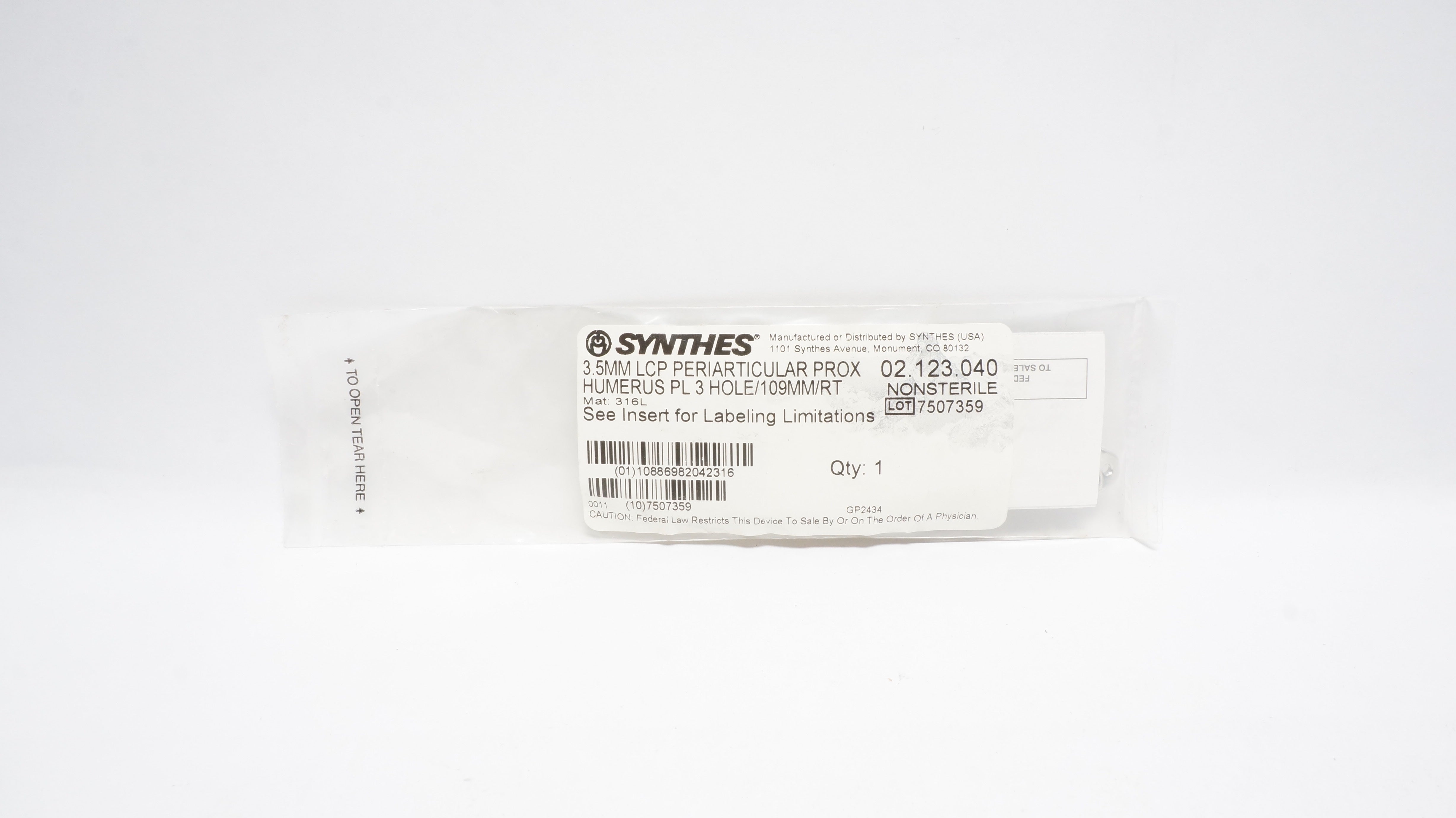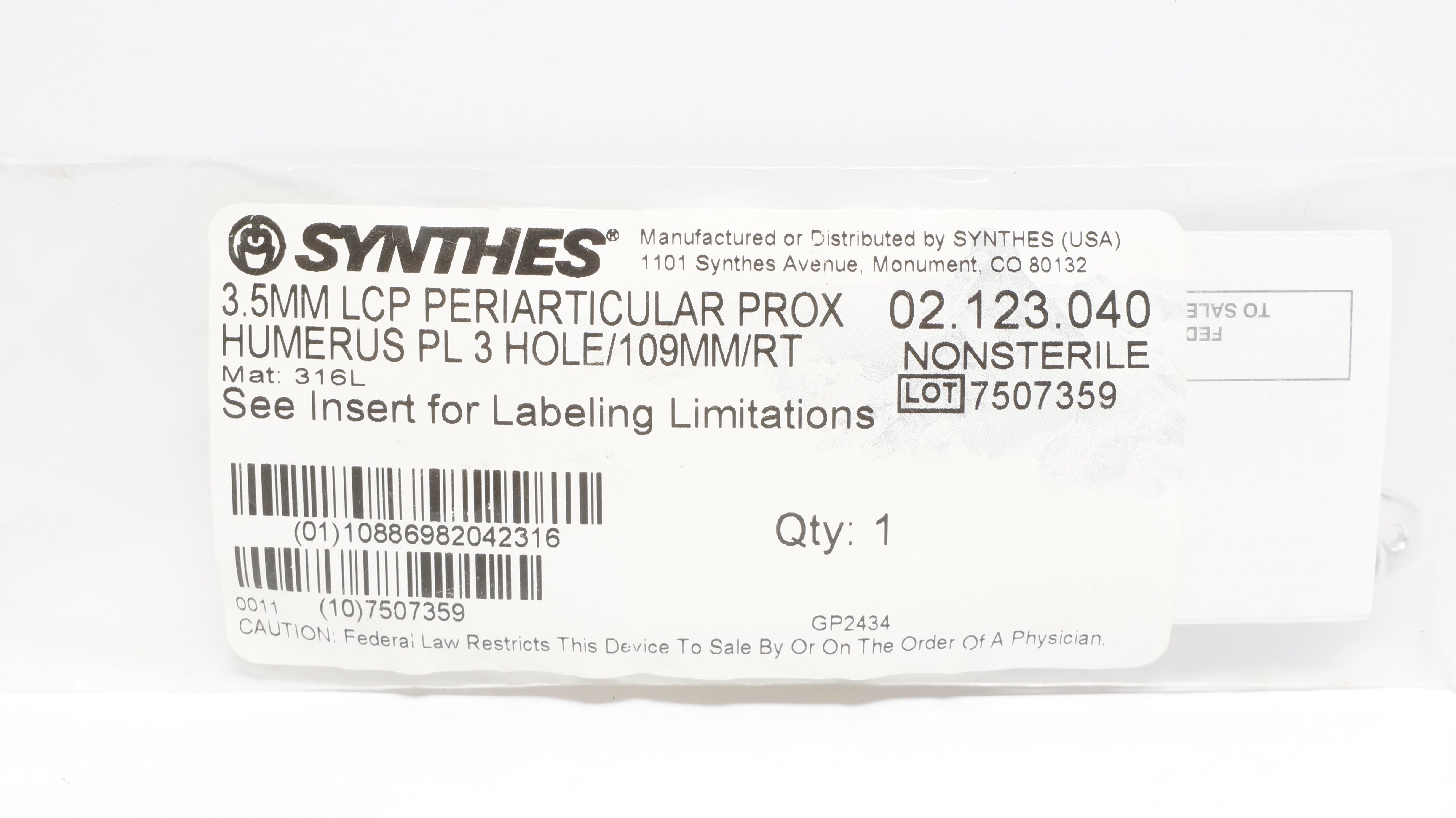 - Synthes 02.123.040 3.5mm LCP Periarticular Pro Humerus PL 3 Hole/109mm/Rt