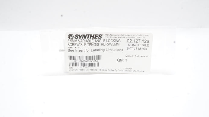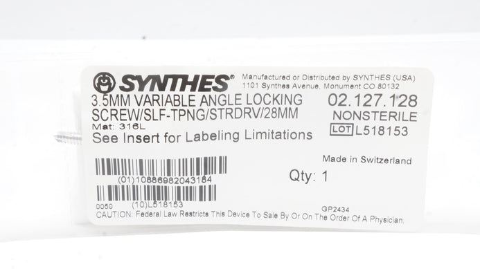 - Synthes 02.127.128 3.5mm Variable Angle Locking Screw Slf-Tpng/Strdrv/28mm