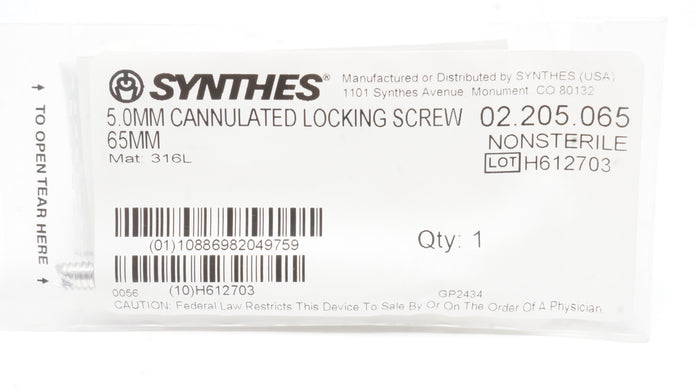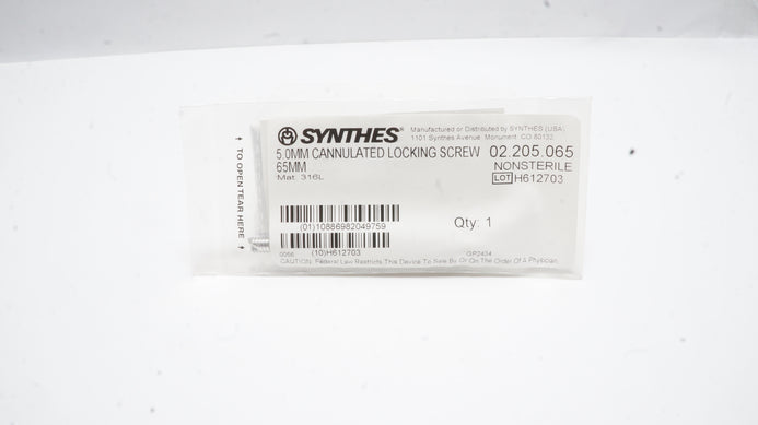 - Synthes 02.205.065 5.0mm Cannulated Locking Screw 65mm