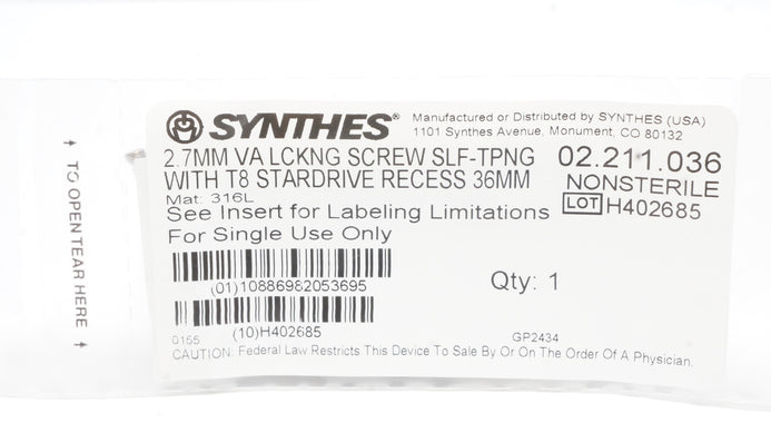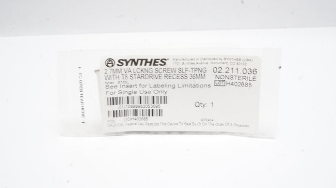 - Synthes 02.211.036 2.7mm VA LCKNG Screw Self/Tapping W/T8 Stardrive Recess 36mm