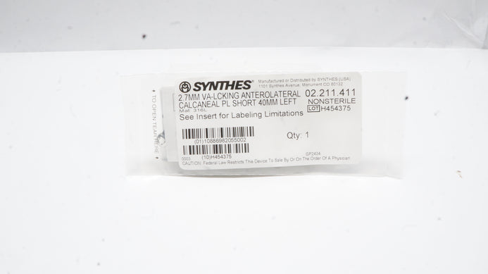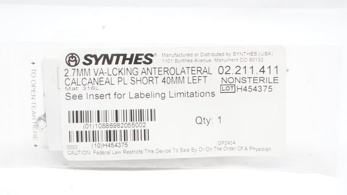 - Synthes 02.211.411 2.7mm VA-LCKING Anterolateral Calcaneal Plate Short 40mm Left
