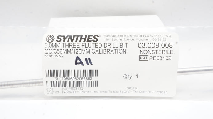 - Synthes 03.008.008 5.0mm Three-Fluted Drill Bit QC/356mm/126mm Calibration