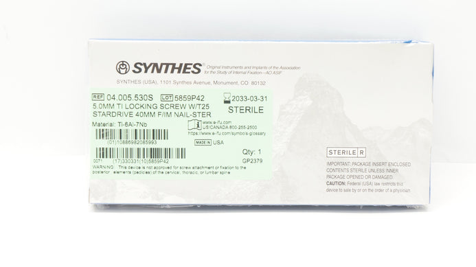 - Synthes 04.005.530S TI T25 Stardrive Locking Screw 5.0mm x 40mm