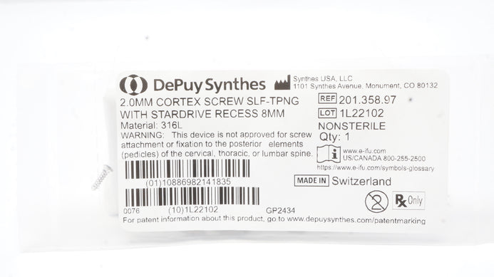 - Synthes 201.358.97 2.0mm Cortex Screw Self-Tapping W/Stardrive Recess 8mm