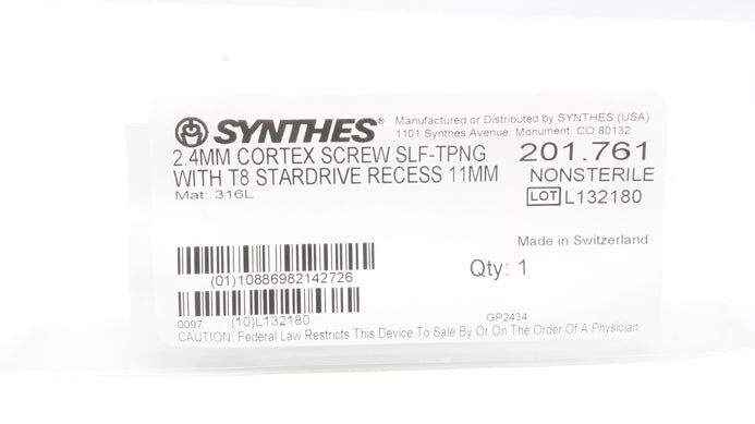 - Synthes 201.761 2.4mm Cortex Screw Self-Tapping W/T8 Stardrive Recess 11mm