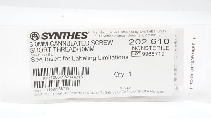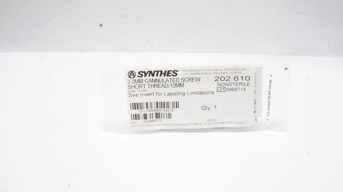 - Synthes 202.610 3.0mm Cannulated Screw Short Thread/10mm