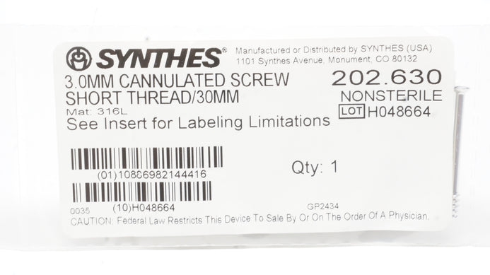 - Synthes 202.630 3.0mm Cannulated Screw Short Thread/30mm