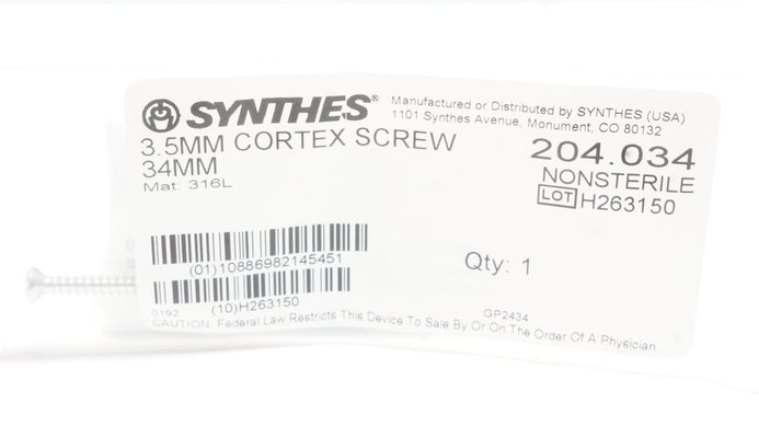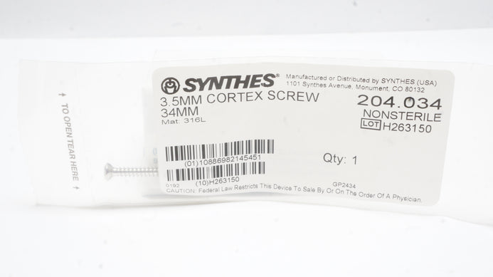 - Synthes 204.034 3.5mm Cortex Screw 34mm