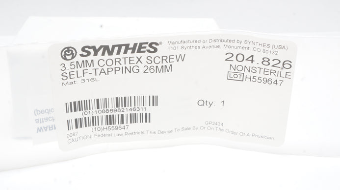- Synthes 204.826 3.5mm Cortex Screw Self-Tapping 26mm