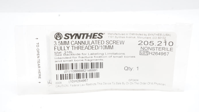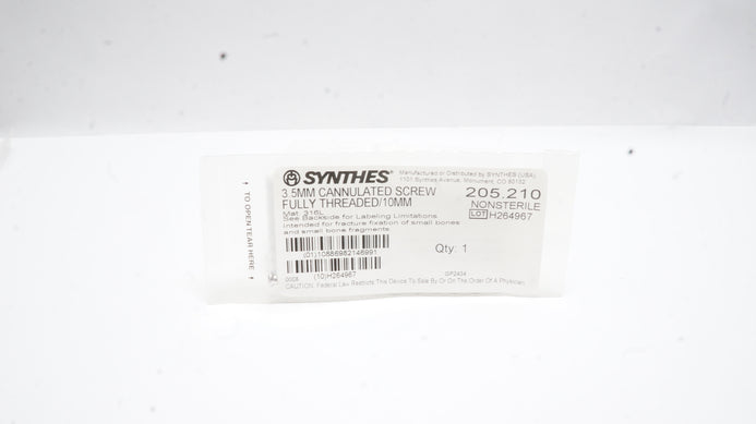 - Synthes 205.210 3.5mm Cannulated Screw Fully Threaded/10mm