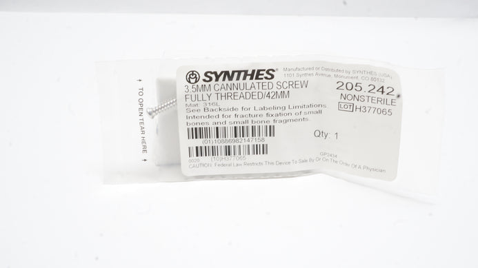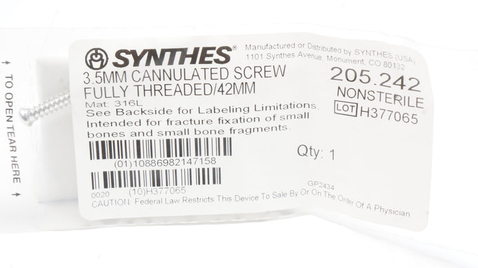 - Synthes 205.242 3.5mm Cannulated Screw Fully Threaded 42mm