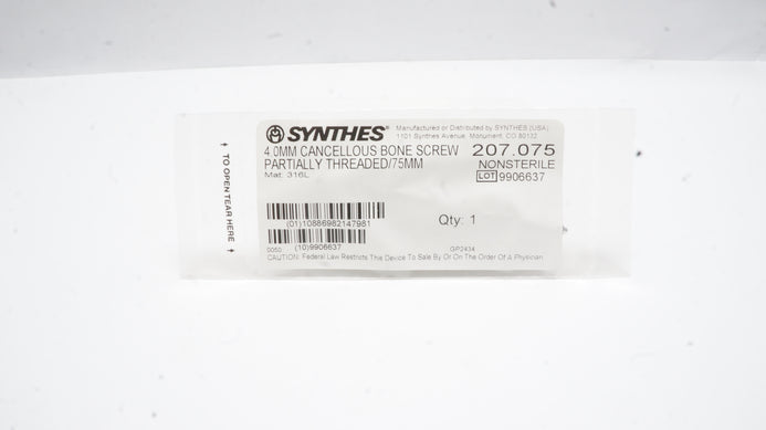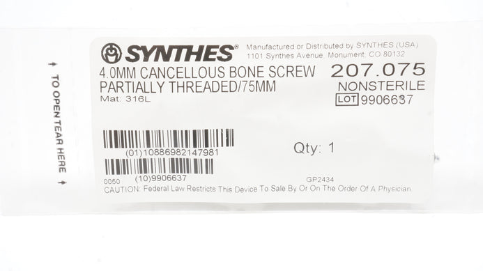- Synthes 207.075 4.0mm Cancellous Bone Screw Partially Threaded 75mm