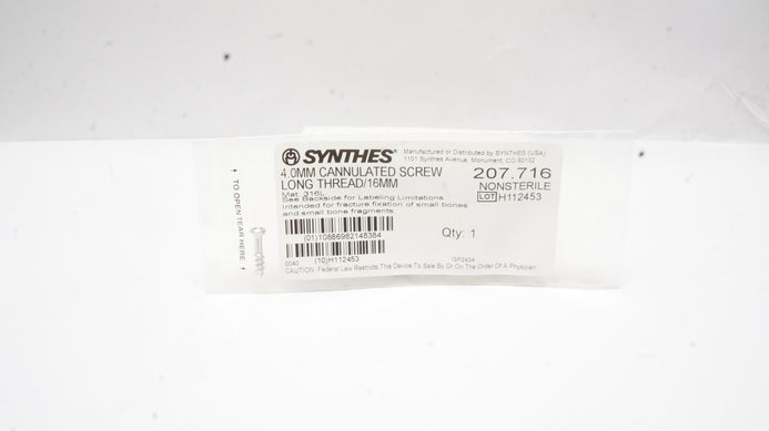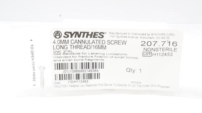 - Synthes 207.716 4.0mm Cannulated Screw Long Thread/16mm