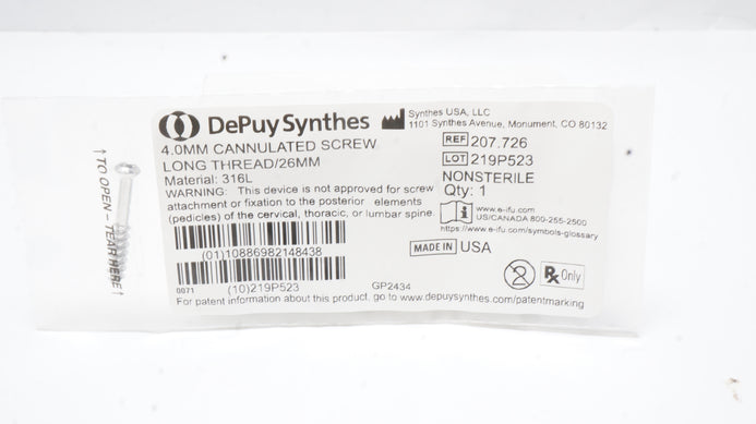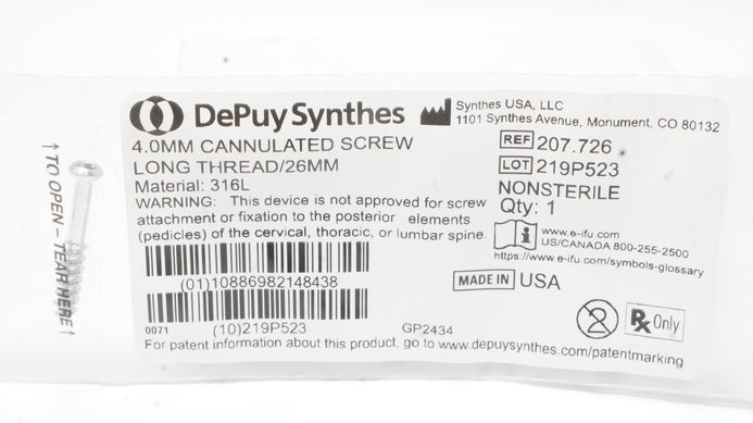 - Synthes 207.726 4.0mm Cannulated Screw Long Thread 26mm