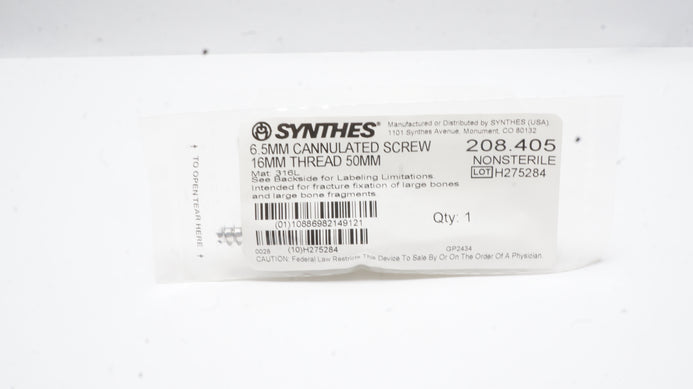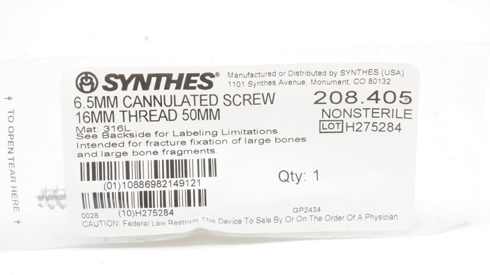 - Synthes 208.405 6.5mm Cannulated Screw 16mm Thread 50mm