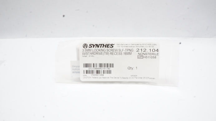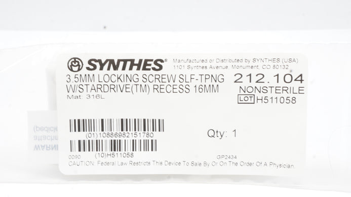 - Synthes 212.104 3.5mm Locking Screw Self-Tapping W/Stardrive (TM) Recess 16mm