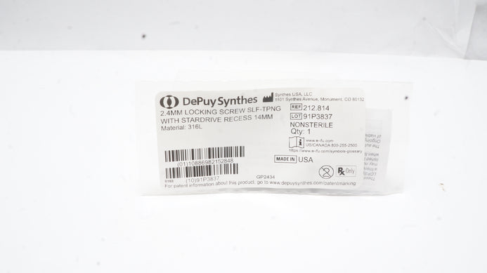 - Synthes 212.814 2.4mm Locking Screw Self-Tapping W/Stardrive Recess 14mm