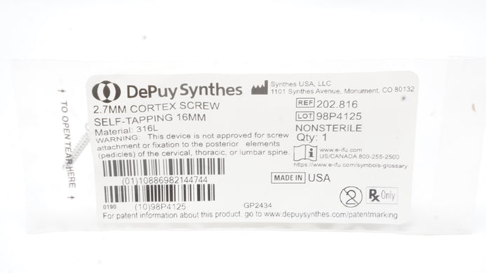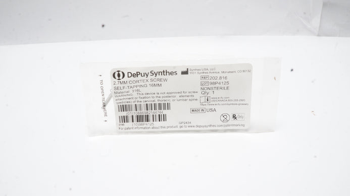 - Synthes 212.818 2.7mm Cortex Screw Self-Tapping 16mm