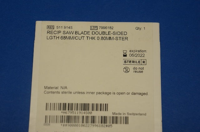- Synthes 511.914S Recip Saw Blade Double-Sided Length 68mm