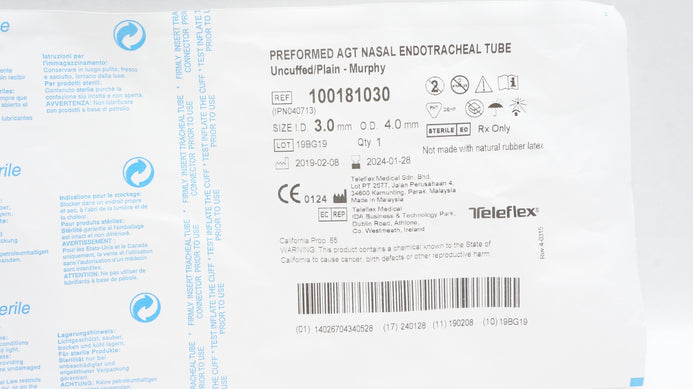 - Teleflex 100181030 Preformed AGT Nasal Endotracheal Tube Uncuffed 3.0 x 4.0mm(x)